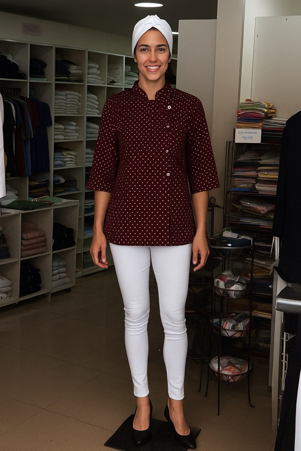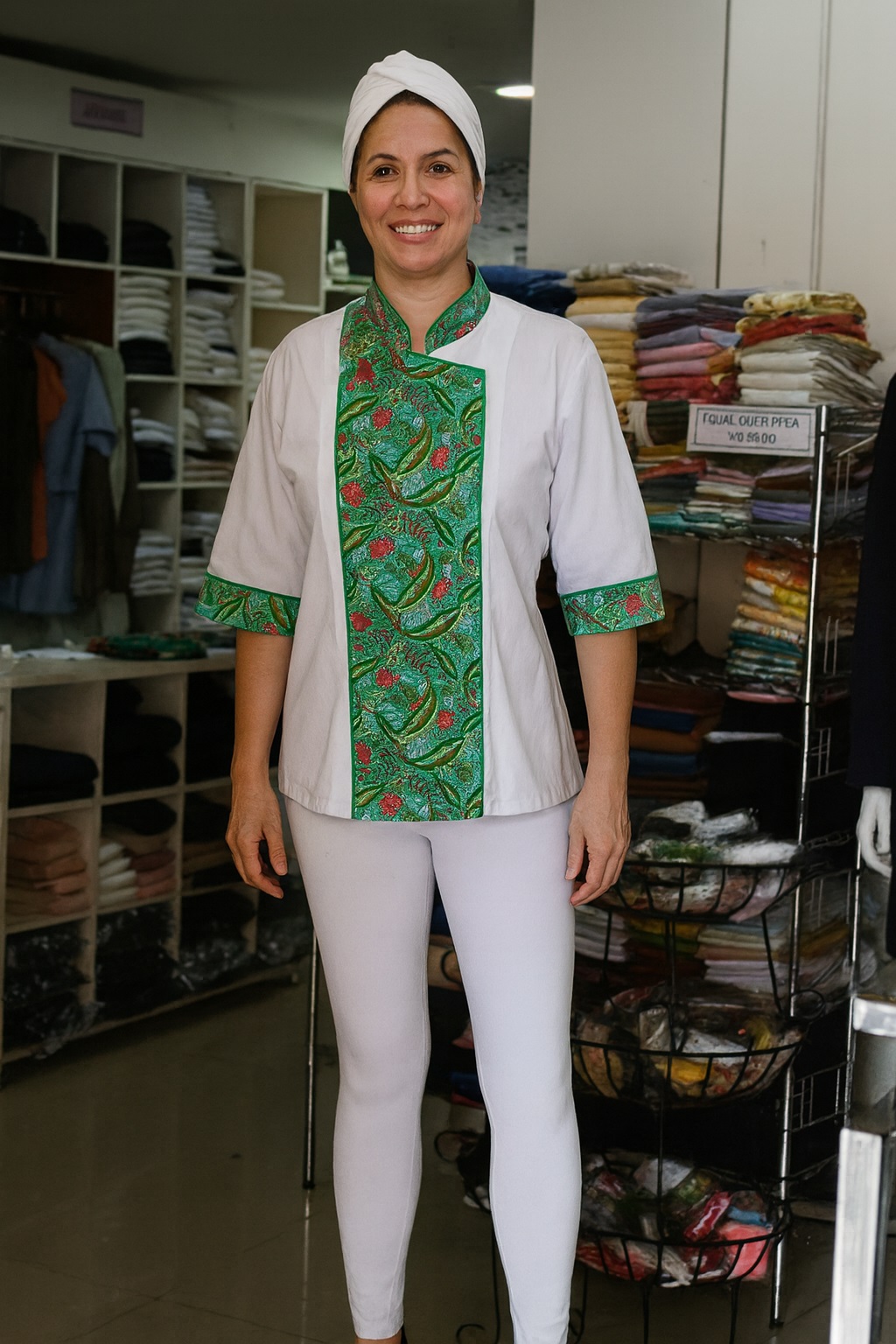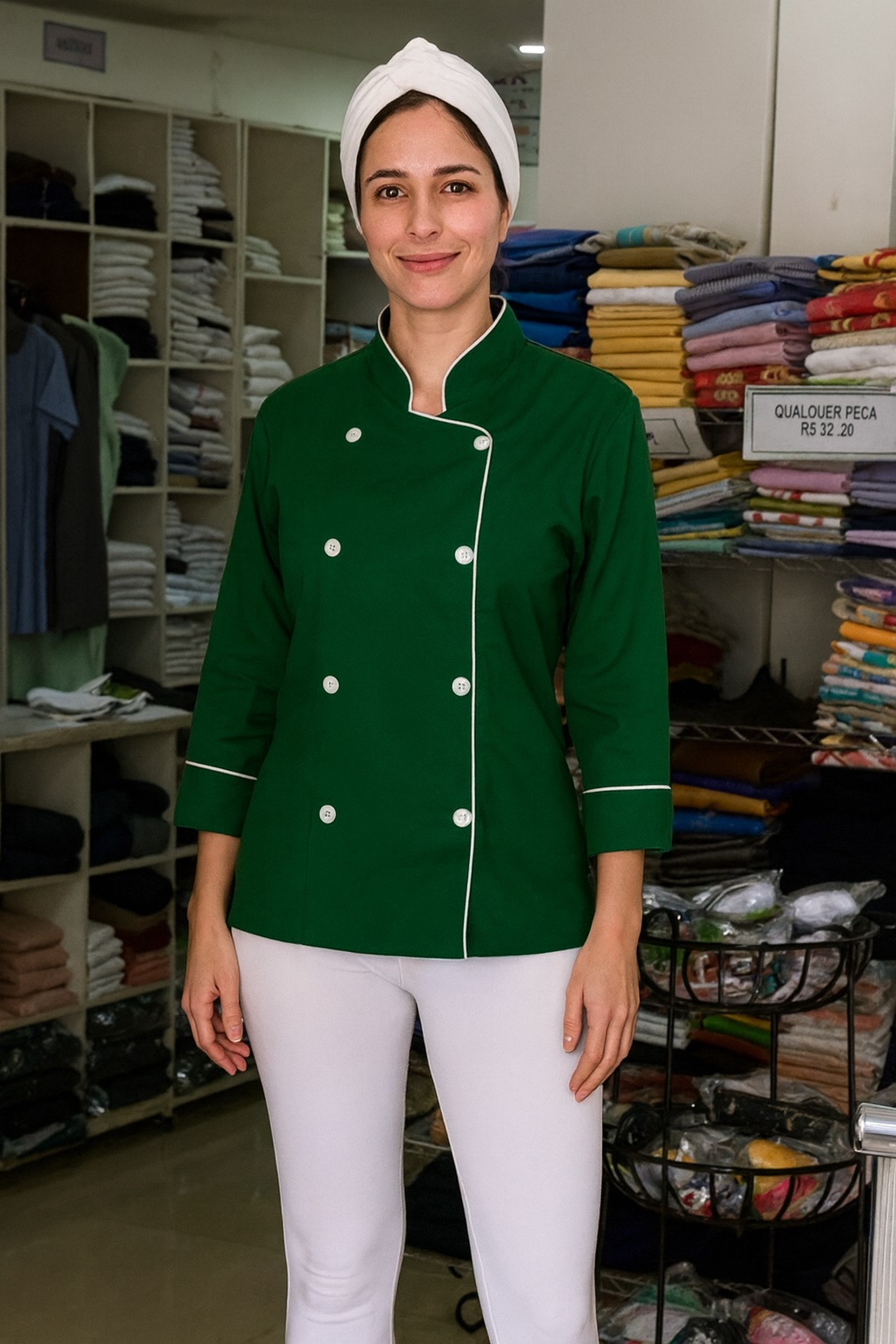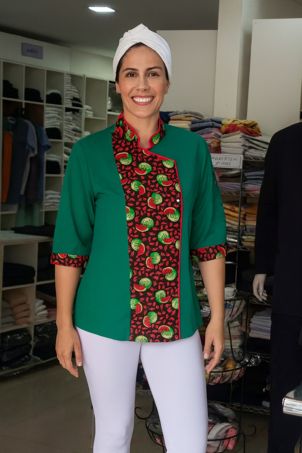 mais conhecido por 'Mestre Cuca', o Dólman, com frente dupla, produzido com tecido leve,